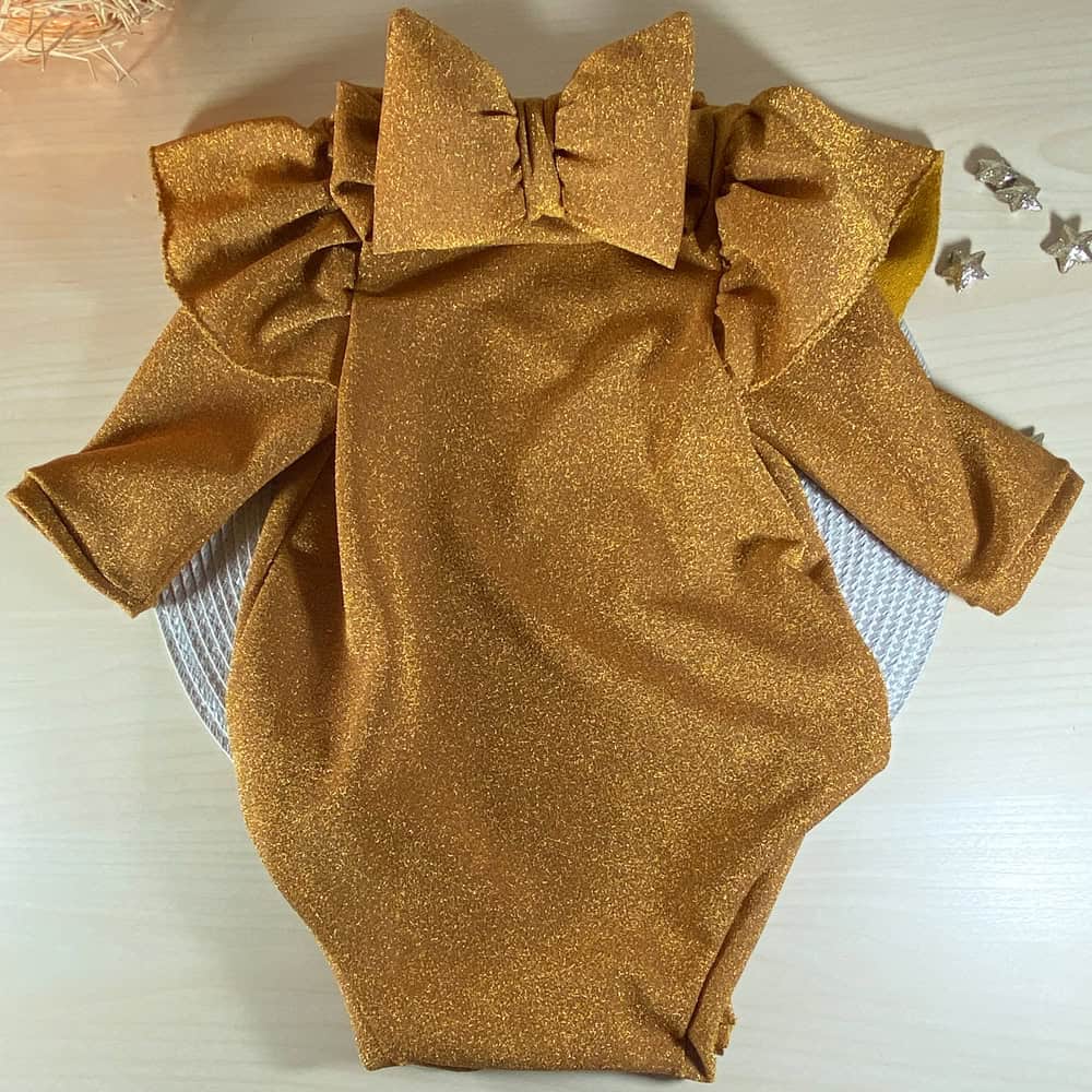 Βρεφικό παιδικό σετ με κορμάκι σε χρυσό χρώμα και κορδέλα, άνετο και κομψό. Ιδανικό για γιορτές, φωτογραφίσεις, βαπτίσεις και ξεχωριστές εμφανίσεις.