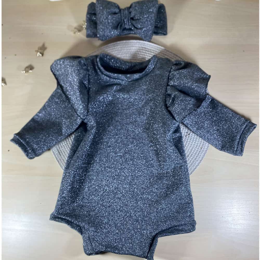 Βρεφικό-παιδικό κορμάκι από λούρεξ ύφασμα σε μαύρο και ασημί χρώμα, σετ με κορδέλα. Άνετο και κομψό, ιδανικό για ιδιαίτερες περιστάσεις και ξεχωριστές εμφανίσεις.