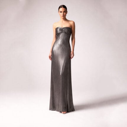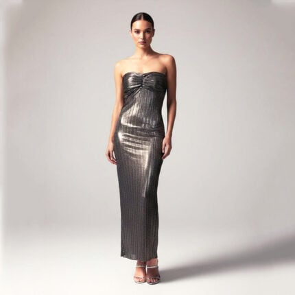 Maxi Φόρεμα σε Ασημί Πλισέ με Πλαϊνό Άνοιγμα εφαρμοστό και φαρδιά γραμμή